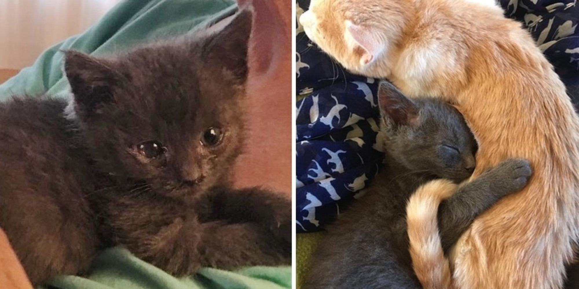 Kitten wordt zuster van een ander gerede kitten en helpt hem genezen door het geven van knuffels