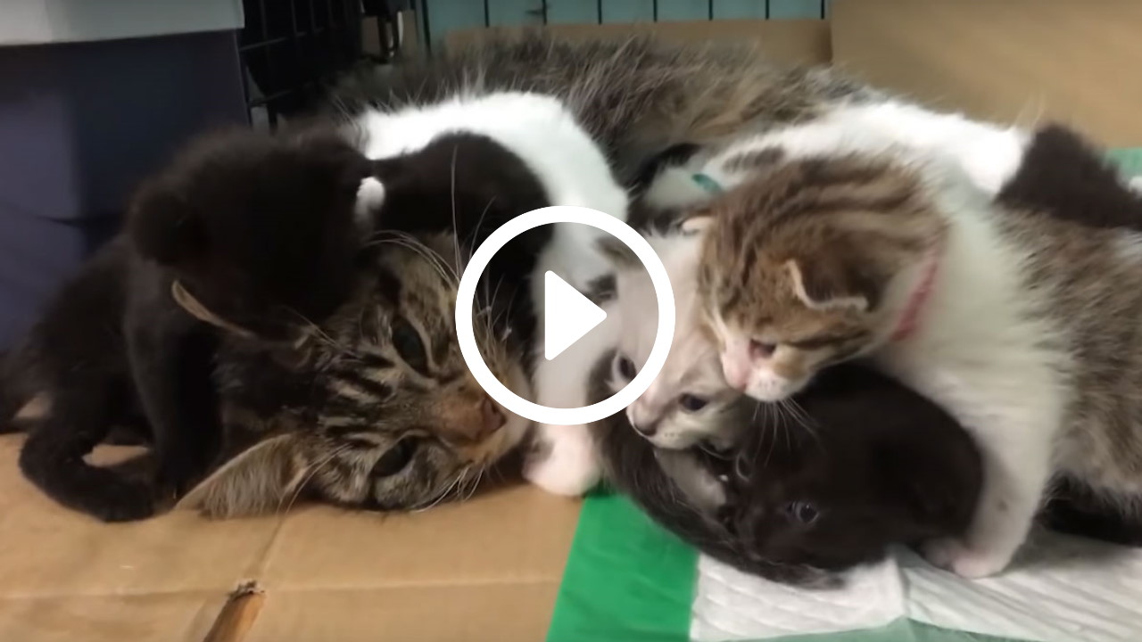 Rouwende moederkat die haar kittens heeft verloren, adopteert anderen kittens [video]