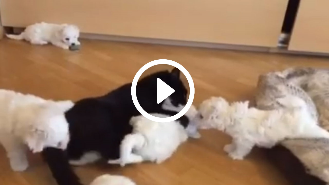 Het is niet gemakkelijk om als kat op vijf puppy’s te passen! [video]