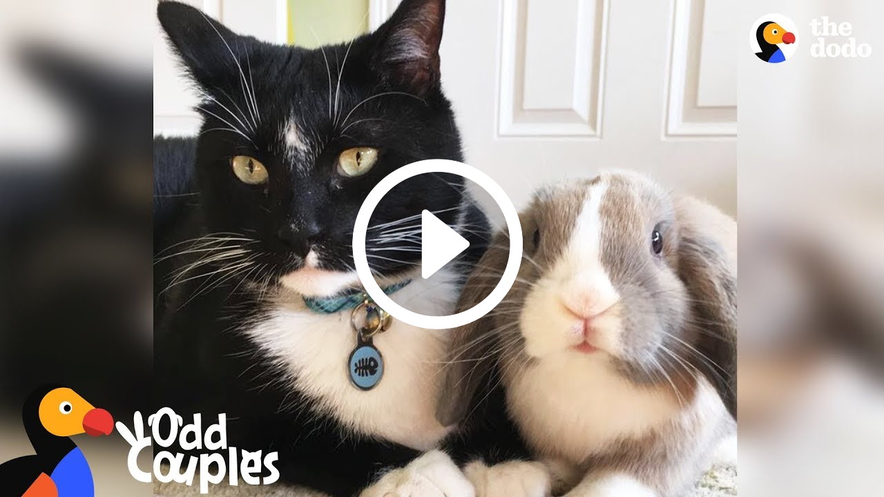 Normaal pittige kat speelt zo voorzichtig met zijn beste vriend, een konijn [video]