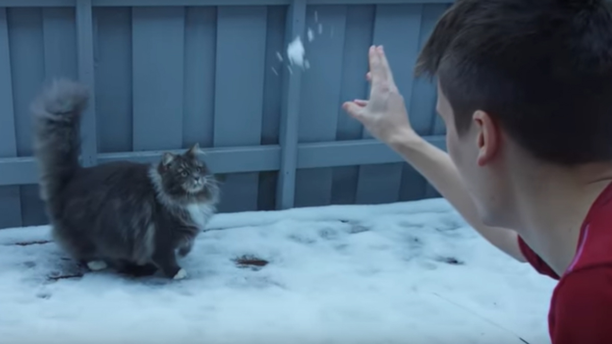 Mooie pluizige kat doet niets liever dan spelen in de sneeuw