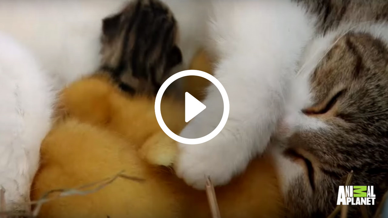 Een moederkat adopteert kleine gele eendjes [video]